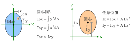 ここで、「 Iox の方が Ioy よりも大きくなる」ことは簡単に察しがつくでしょう。なぜなら、回転軸から遠い部分に断面積をもつものほど断面2次モーメントが大きくなるからです。