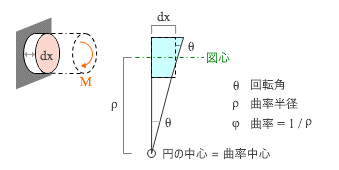 図の右側は、左側にあるような一端が固定された部材が曲げモーメントを受けた場合の、固定端から dx の範囲にある小さな断片の変形の様子を拡大したものです。 注 )